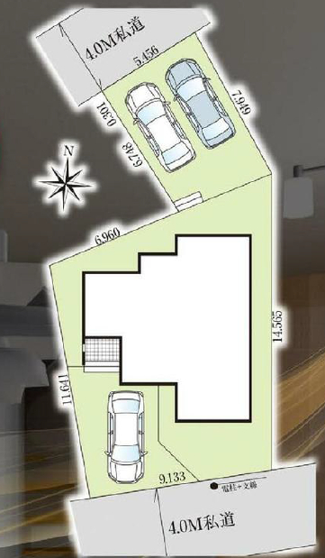 | 接道 | 北西 4m(幅員) 私道 5.4m(接面) 南東 3.9m(幅員) 私道 9.1m(接面) |