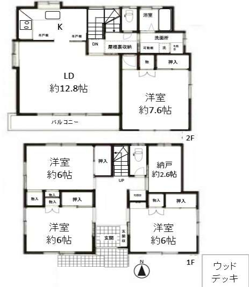 | 間取詳細 | (1F)洋6.0、(1F)洋6.0、(1F)洋6.0、(1F)納戸2.6、(2F)LD12.8、(2F)洋7.6 |