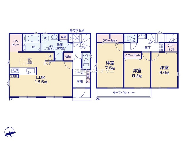 間取詳細 | (1F)LDK16.5、(2F)洋7.5、(2F)洋6.0、(2F)洋5.2 |