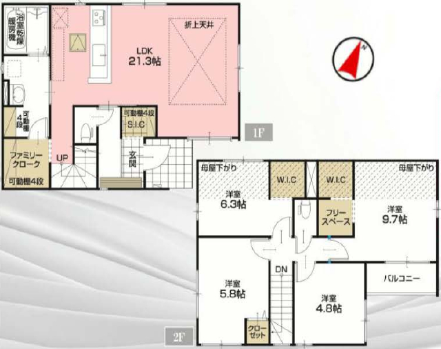 間取詳細 | (1F)LDK21.3、(2F)洋9.7、(2F)洋6.3、(2F)洋5.8、(2F)洋4.8 |
