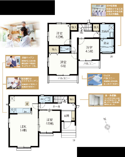 | 間取詳細 | (1F)LDK14.0、(1F)洋4.5、(2F)洋6.0、(2F)洋4.5、(2F)洋4.5 |