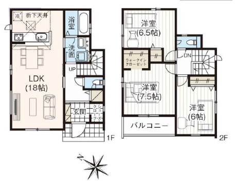 | 間取詳細 | (1F)LDK18.0、(2F)洋7.5、(2F)洋6.5、(2F)洋6.0 |