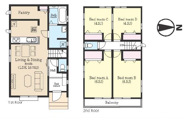 | 間取詳細 | (1F)LDK18.75、(2F)洋6.5、(2F)洋6.5、(2F)洋4.5、(2F)洋4.5 |