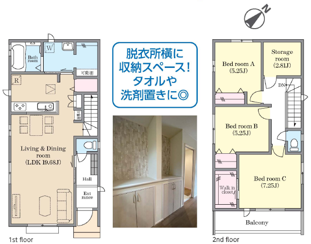 | 間取詳細 | (1F)LDK19.68、(2F)洋7.25、(2F)洋5.25、(2F)洋5.25、(2F)S2.8 |
