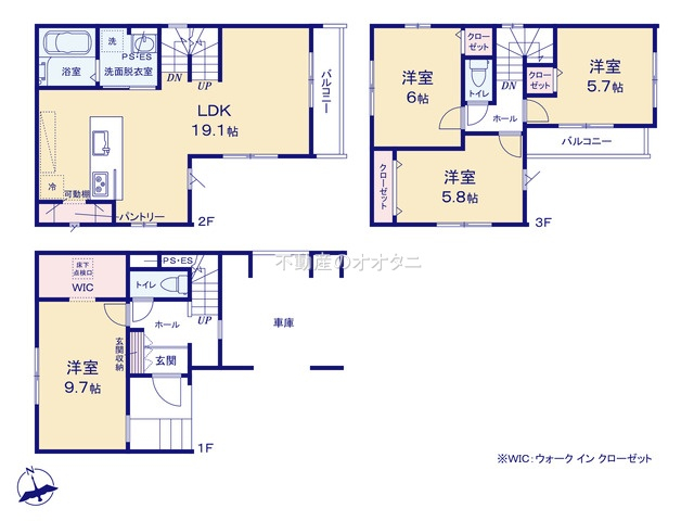 | 間取詳細 | (1F)洋9.7、(2F)LDK19.1、(3F)洋6.0、(3F)洋5.8、(3F)洋5.7 |