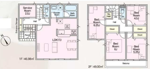 | 間取詳細 | (1F)LDK17.0、(2F)洋6.25、(2F)洋6.0、(2F)洋5.25、(2F)洋4.5 |