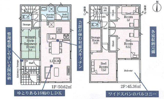 | 間取詳細 | (1F)LDK16.0、(1F)和5.0、(2F)洋7.5、(2F)洋6.5、(2F)洋5.0、(2F)S2.2 |