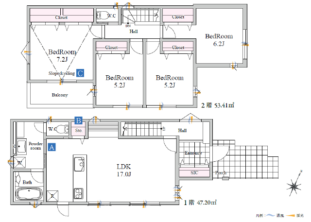 | 間取詳細 | (1F)LDK17.0、(2F)洋7.2、(2F)洋6.2、(2F)洋5.2、(2F)洋5.2 |