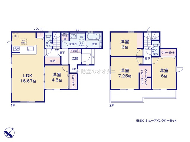 | 間取詳細 | (1F)LDK16.67、(1F)洋4.5、(2F)洋7.25、(2F)洋6.0、(2F)洋6.0 |