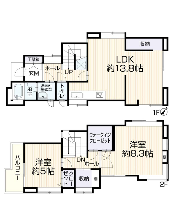 | 間取詳細 | (1F)LDK13.8、(2F)洋8.3、(2F)洋5.0 |