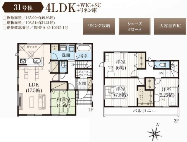 | 間取詳細 | (1F)LDK17.5、(1F)和4.5、(2F)洋7.5、(2F)洋6.0、(2F)洋5.25 |