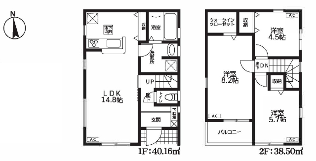 | 間取詳細 | (1F)LDK14.8、(2F)洋8.2、(2F)洋5.7、(2F)洋4.5 |