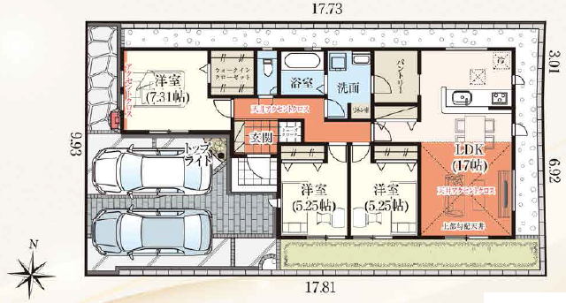 | 間取詳細 | (1F)LDK17.0、(1F)洋7.31、(1F)洋5.25、(1F)洋5.25 | ||