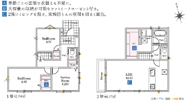 | 間取詳細 | (1F)洋6.9、(1F)洋4.5、(1F)S5.25、(2F)LDK16.0 | ||