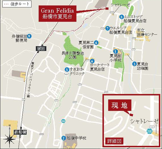 | 小学校 | 船橋市立夏見台小学校 720m | 中学校 | 船橋市立船橋中学校 880m |